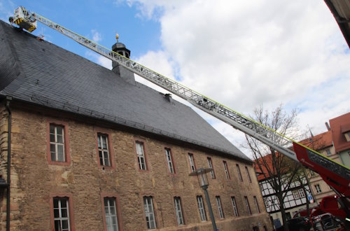 Zur Installation der neuen Sirenenanlage wurde die Drehleiter der Freiwilligen Feuerwehr Sangerhausen haute als "Bauhelfer" eingesetzt.