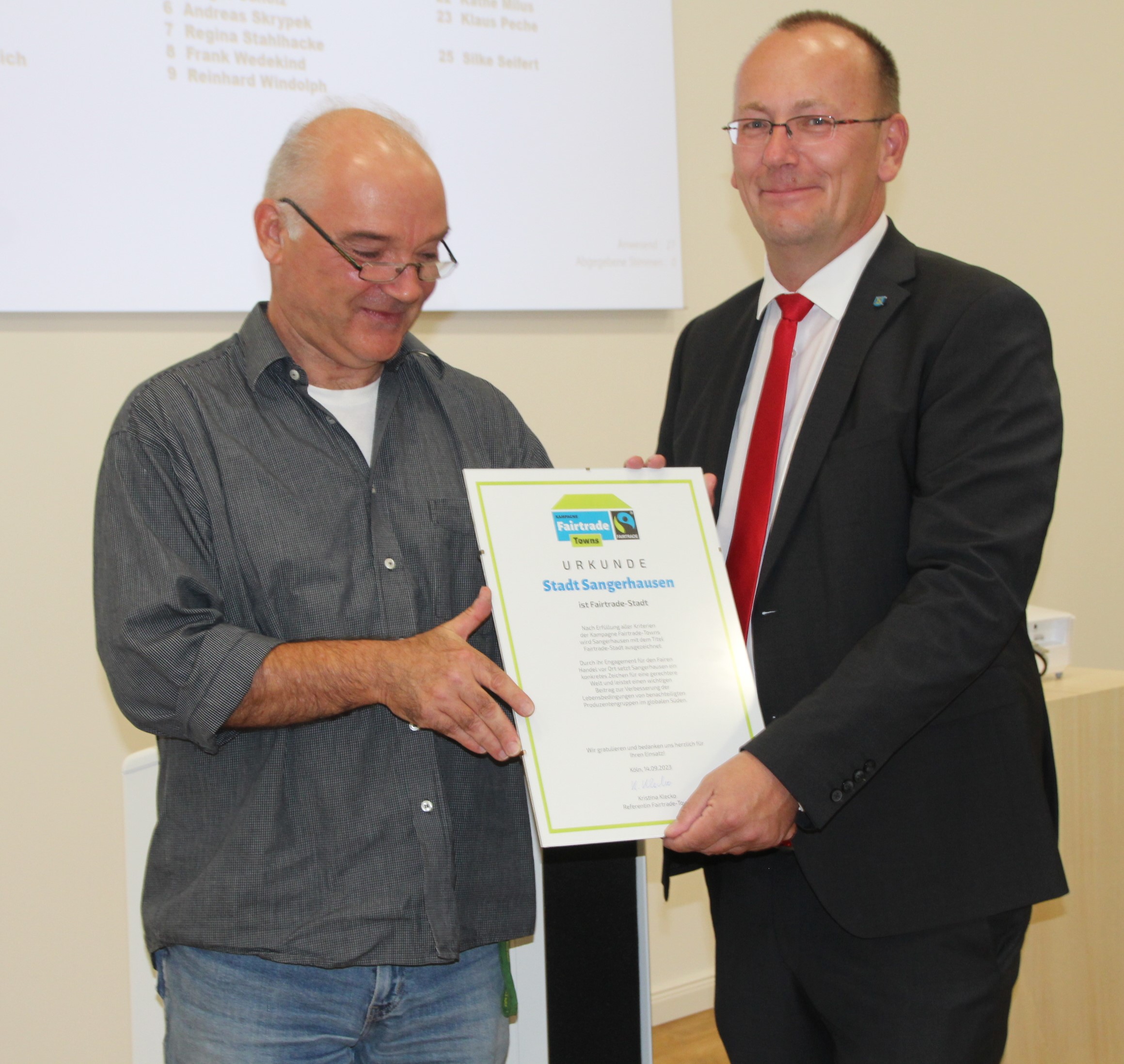 In der gestrigen Ratssitzung konnte Oberbürgermeister (OB) Sven Strauß die Urkunde zur Auszeichnung als Fairtrade-Stadt aus den Händen von Norbert Jung (B.l.) entgegen nehmen. Sangerhausen ist damit die 8. ausgezeichnete Stadt in Sachsen-Anhalt. Deutschlandweit sind es mittlerweile 800 Städte, die sich dieser Kampagne angeschlossen haben.