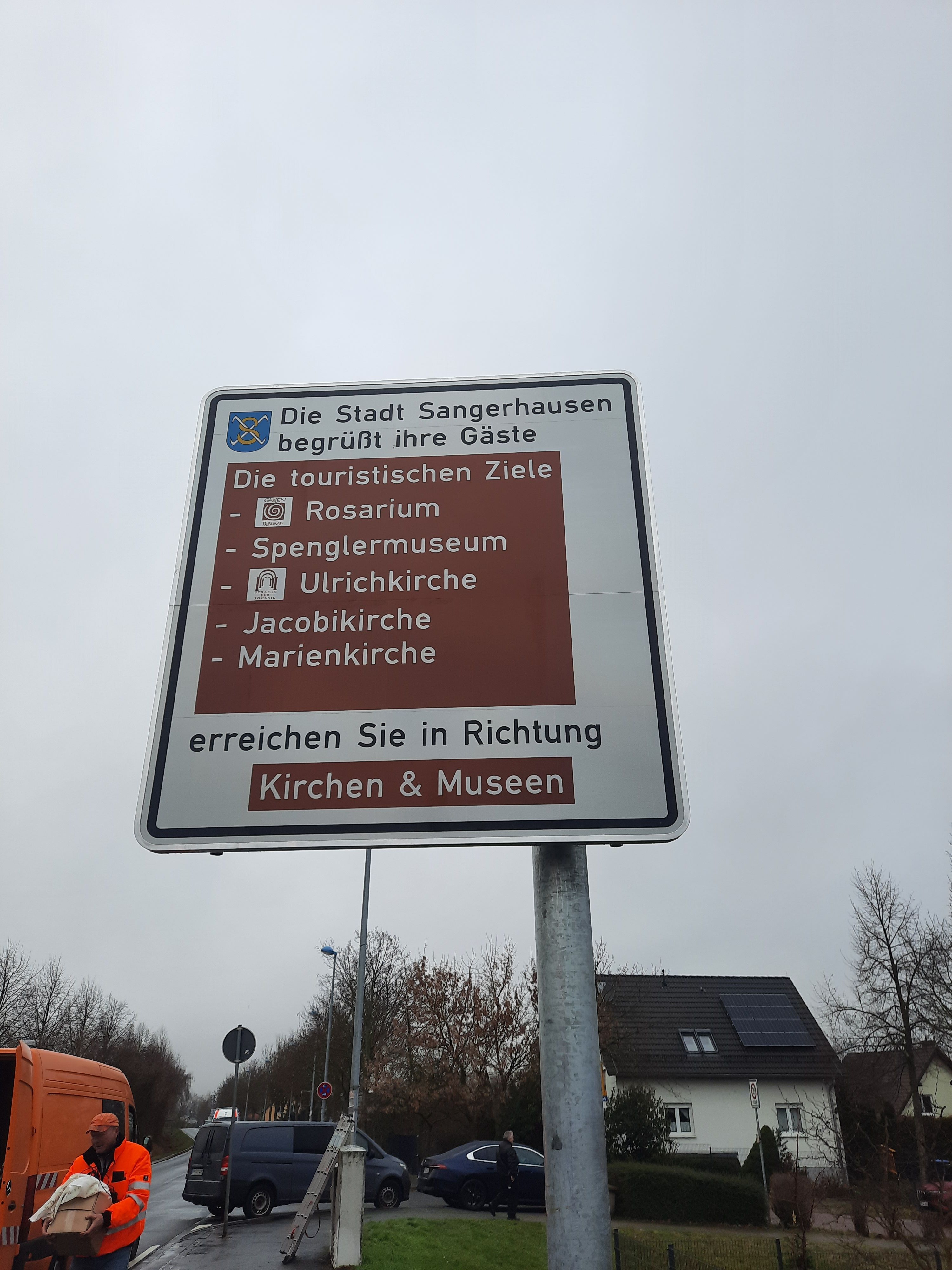 Es befindet sich am Ortseingang Sangerhausen (B86) in Richtung Rosarium und weist auf das Europa-Rosarium, das Spenglermuseum, die Ulrichkirche, die Jacobikirche und die Marienkirche hin.