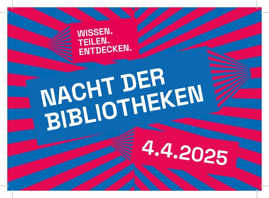 Am 4. April 2025 findet erstmals die bundesweite "Nacht der Bibliotheken" unter dem Motto "Wissen.Teilen.Entdecken." statt.