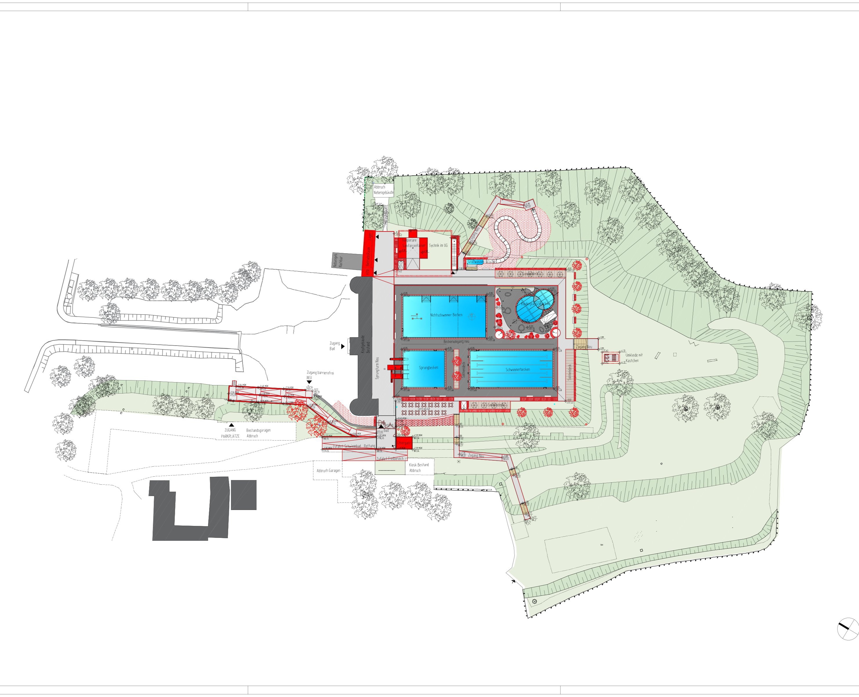 Die abschließende Grünflächengestaltung, einschließlich Pflanzung von schattenspendenden Bäumen, ist witterungsbedingt erst im Herbst möglich. Ebenso können erforderliche Restarbeiten im Umfeld des Stadtbades, wie Gestaltung der Außen- und Parkflächen, Außenbeleuchtung etc., erst nach Ende der Badesaison ausgeführt werden.