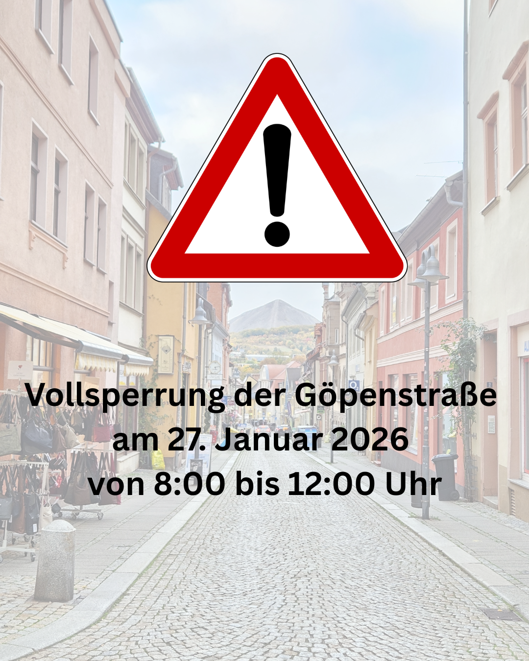 22. Januar 2026 Vollsperrung der Göpenstraße Aufgrund der Lieferung und Montage von Schaufenster-Verglasungen muss die Göpenstraße im Bereich der Hausnummer 15 in Sangerhausen am 27.01.2026 von 8:00 bis 12:00 Uhr voll gesperrt werden. Erstellt am 22. Januar 2026. Geändert am 22. Januar 2026.