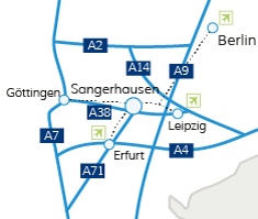 Über die Autobahnen A 38/A 143 und die A 71 und zu den Ballungszentren Halle, Leipzig, Erfurt, Göttingen.